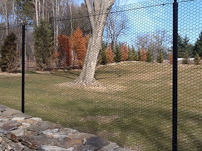 Silvestri Fence’s toughest and least visible deer fence. Steel wire completely covered in black PVC. The solid hexagon cells absorbs the force place against it creating a remarkable gelatin effect. Silvestri Fence uses a design developed in New Zealand. This high-tensile fencing system utilizes fluent 12-1/2 gauge wire with a yield strength of 200,000 pounds per square inch, or a toughness of 1,600 pounds per wire. Conventional fencing wire conventionally has a yield strength of less than 60,000 pounds per square inch.